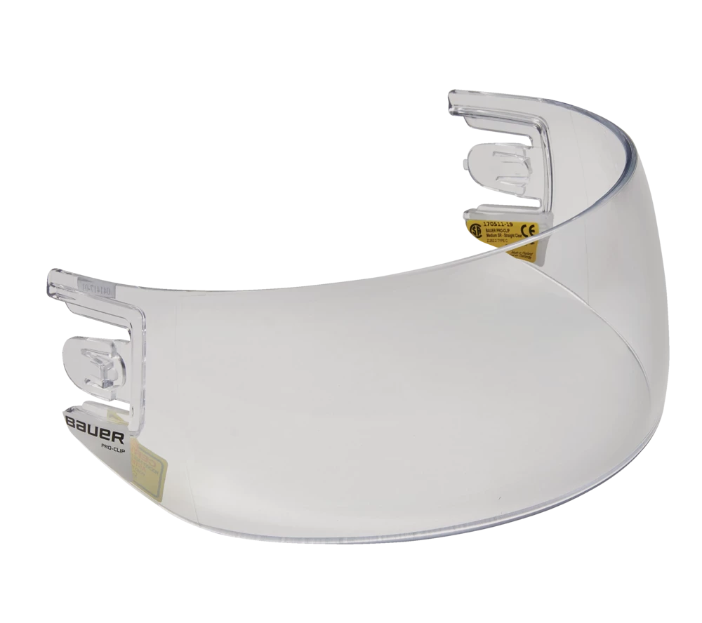 - Bauer Pro Clip Visor is a high impact polycarbonate shield with a quick click feature for tool-less shield replacement